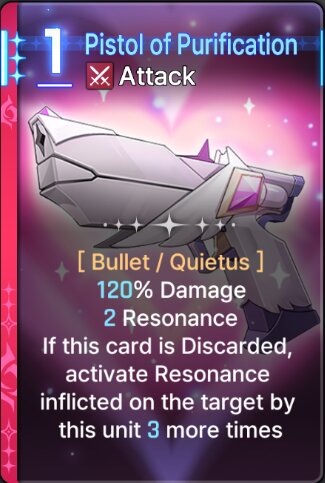 | #1 | [Bullet] [Quietus] 180% Damage 3 Resonance If this card is Discarded, activate Resonance inflicted on the target by this unit 5 more times. | High Value Epiphany | ||