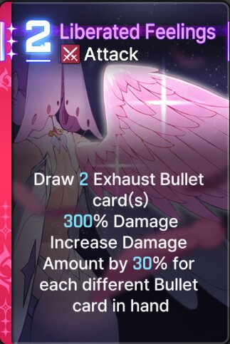 ![]() | Draw 2 Exhaust Bullet card(s), 300% Damage, Increase Damage Amount by 30% for each different Bullet card in hand. |
