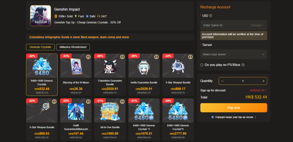 Except for the materials that we have already known, there are also 3 kinds of new materials to obtain. And before we start introducing it, we recommend you to top up Genesis Crystals on Enjoygm for Columbina’s Banner.